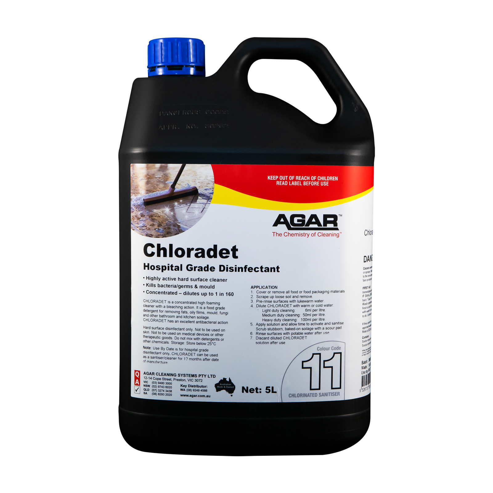 CHLORADET contains available chlorine which is present in solution in the form of sodium hypochlorite and hypochlorous acid. Hypochlorous acid is a powerful germ-killing agent which kills bacteria/germs. CHLORADET also contains caustic alkali and detergents to provide an excellent cleaning action. It will remove cooking fats, smoke films, greasy marks, carbon deposits, food spills, mould, and other soilage found in food preparation areas, kitchens and bathrooms. Excellent for removing ingrained dirt from ceramic tiles.