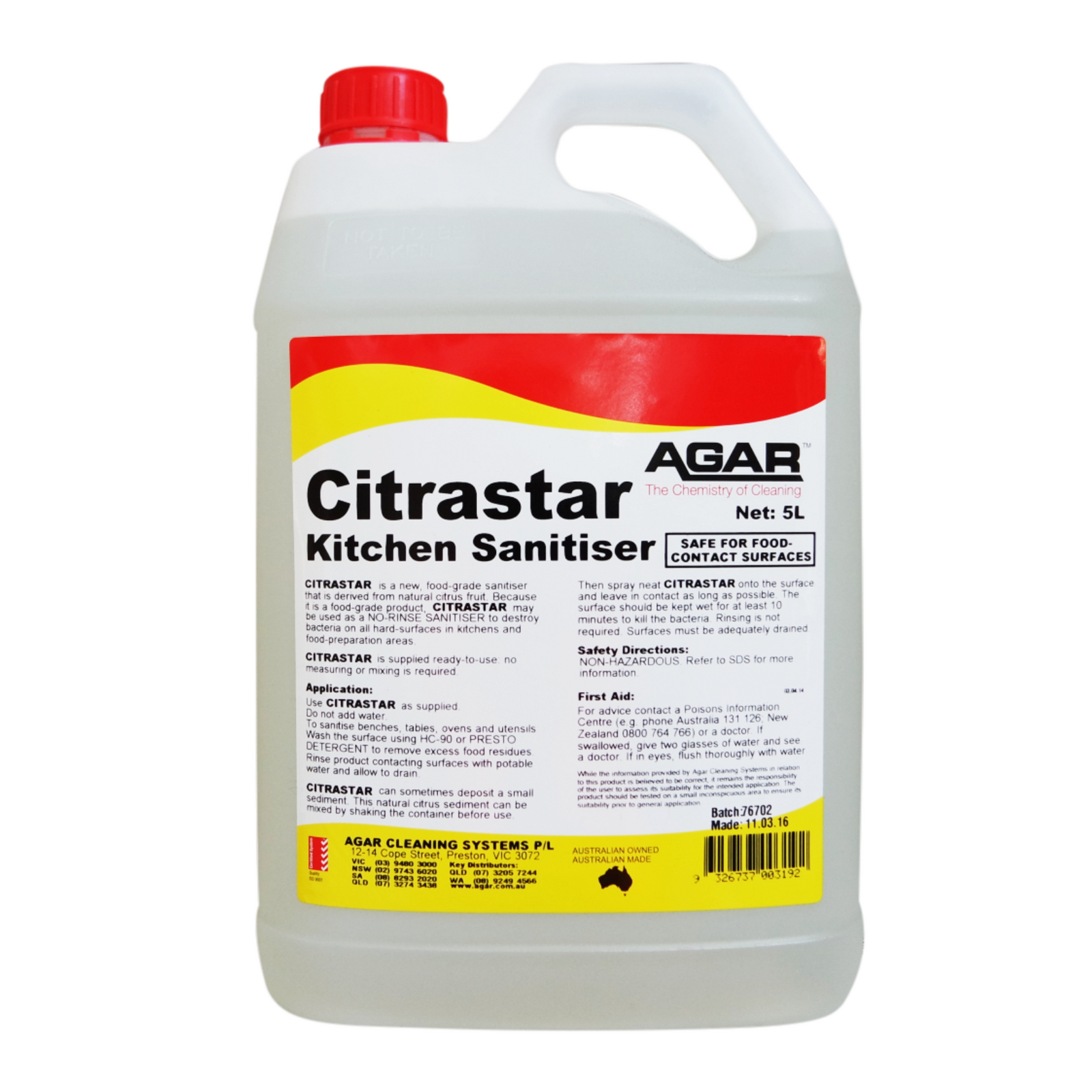 Citrastar is a food-grade sanitiser that is derived from natural citrus fruit. It may be used to destroy bacteria on all hard surfaces in kitchens and food-preparation areas.