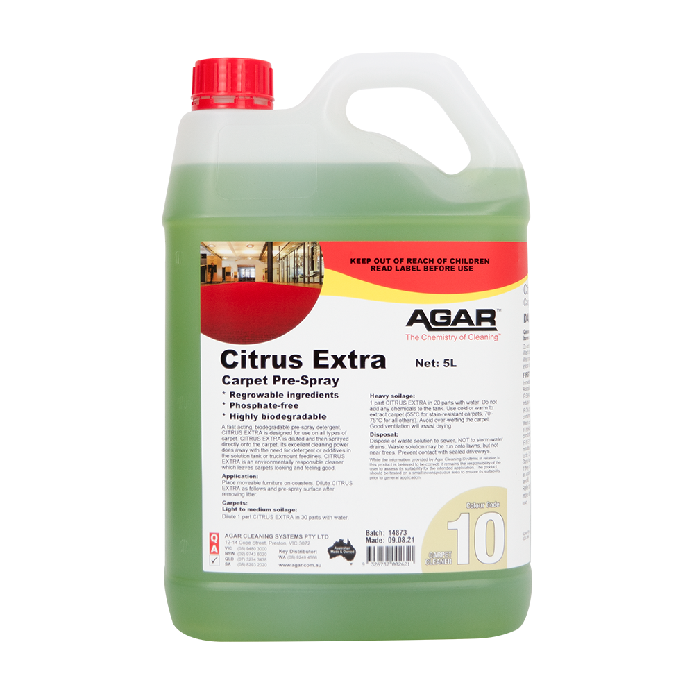 CITRUS EXTRA is based on natural orange oils which have a strong cleaning action and a pleasant fragrance. CITRUS EXTRA’s excellent cleaning power provides great economy of use and does away with the need for detergent or additives in the solution tank or the feed lines of truck-mounted units. CITRUS EXTRA is a free rinsing cleaner, so after pre-spraying, one pass with water in the wand is all it takes to clean and revive the carpet. Being a low-alkaline pre-spray, CITRUS EXTRA is safe to use on carpets in trains, boats and planes and will not affect aluminium, fibreglass or painted surfaces. It is also less likely to cause skin irritations.