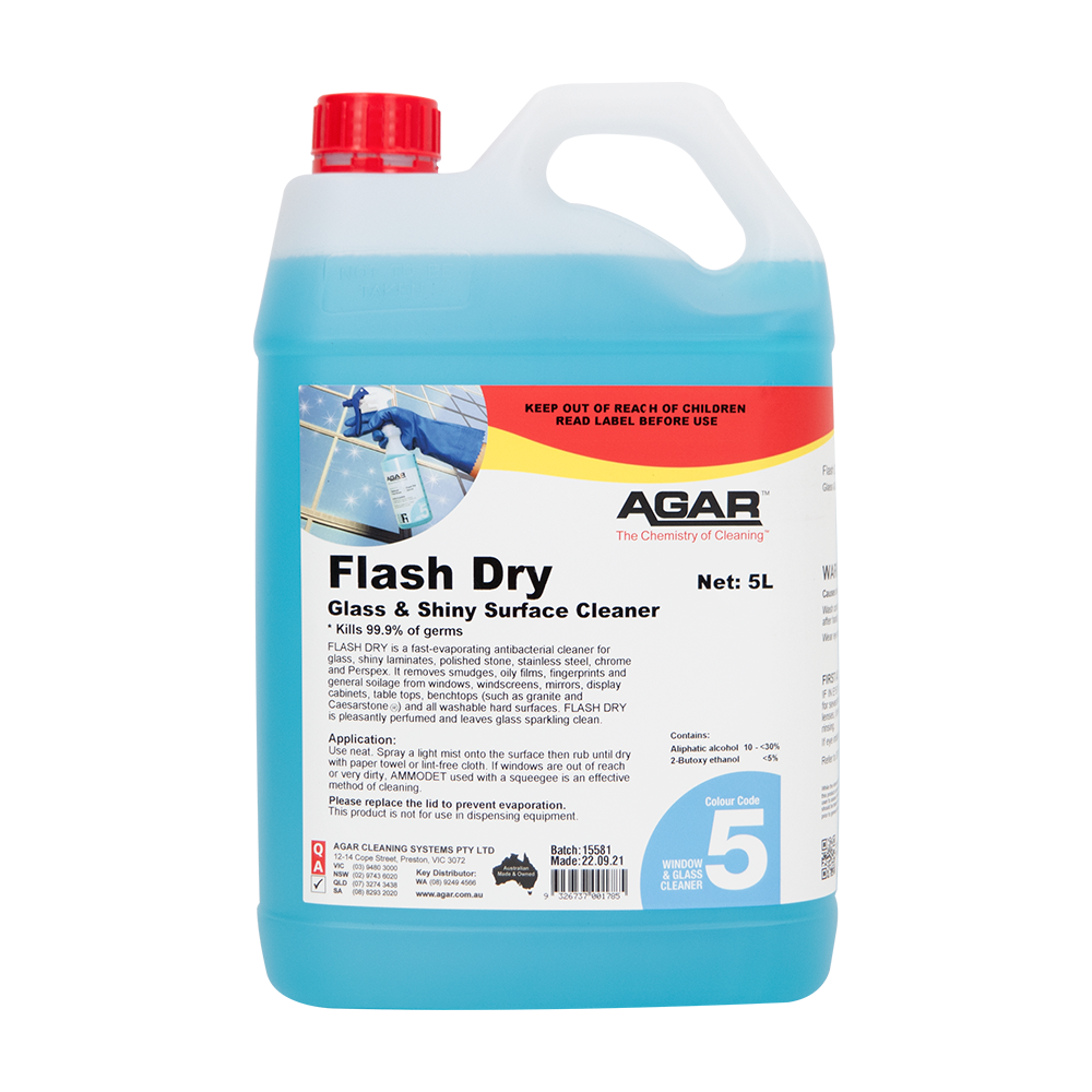 FLASH DRY will remove smudges, oily films, fingerprints and general soilage from glass, shiny laminates, stainless steel, chrome and perspex surfaces. It is ideal for cleaning windows, tinted glass, mirrors, display cabinets, tabletops, benches, poker machines, car, truck and bus windscreens, and a wide variety of other shiny, hard surfaces.