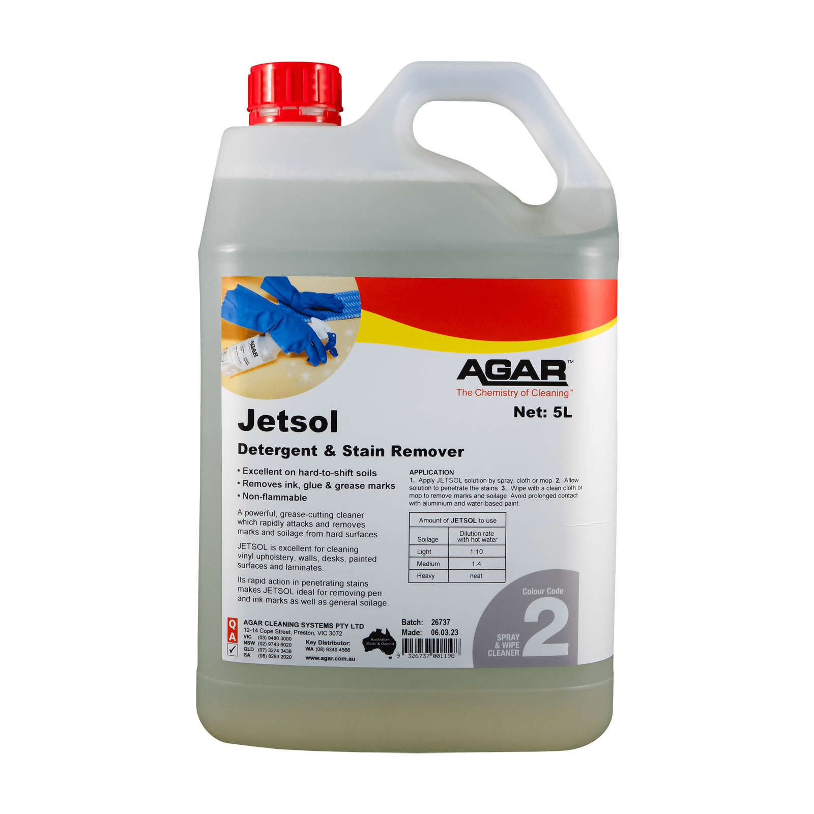 JETSOL will remove all soils including dirt, food spills, greasy oil films, fat, carbon and smoke deposits, bathroom build-ups, lipstick etc. JETSOL will clean all washable hard surfaces – walls, stoves, laminex, glass, shower recesses, paintwork, venetian blinds, porcelain, stainless steel, chrome etc. It is great for school desks and bank counters where ink stains are found.
