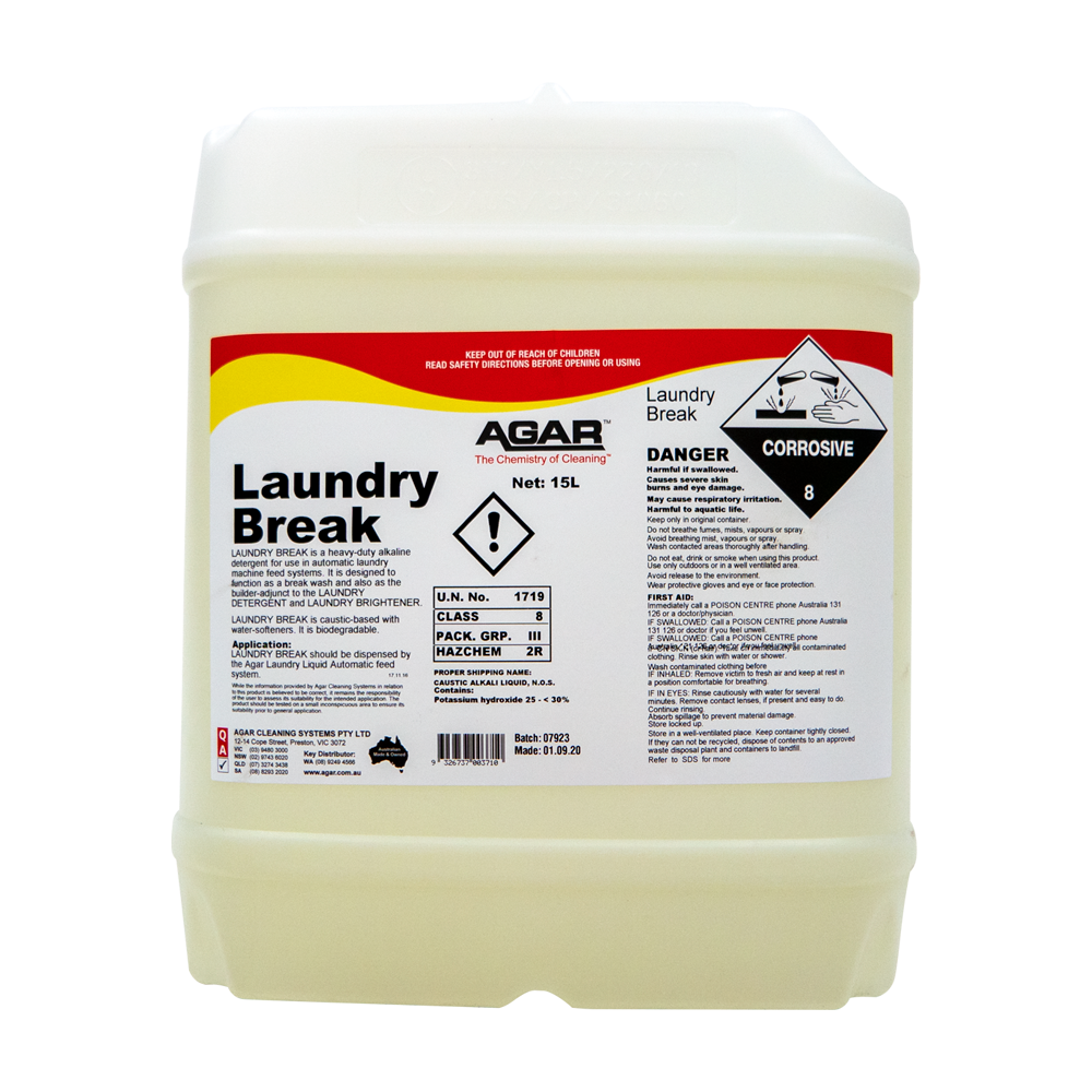 LAUNDRY BREAK is a heavy-duty alkaline detergent made for industrial, institutional and commercial laundries where washing machines are supplied by Automatic Liquid Detergent Feed Systems.
