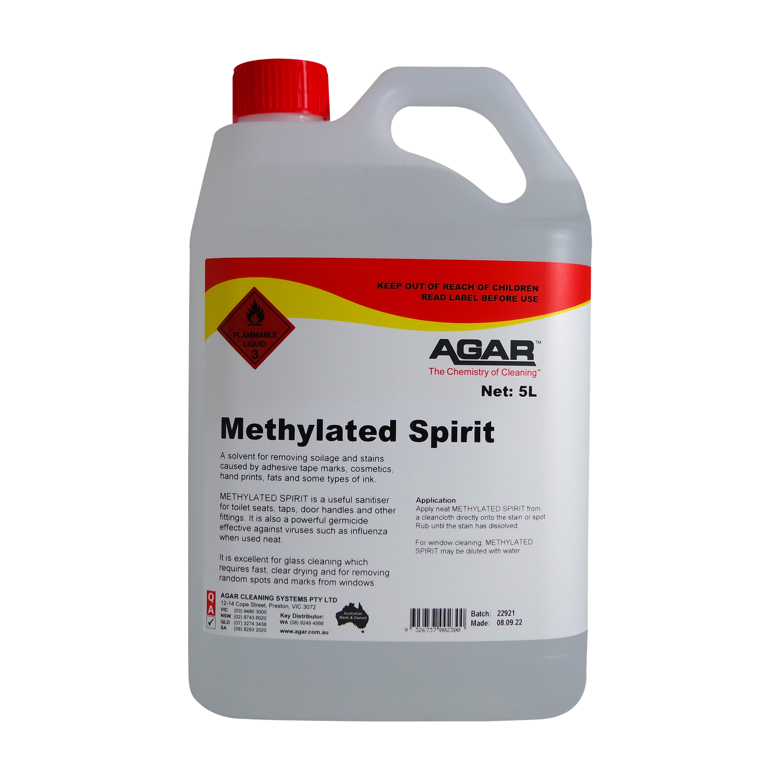 METHYLATED SPIRIT is suitable for removing adhesive tape marks, cosmetics, touch marks, fats and some types of ink stains from hard surfaces. It is particularly useful for removing random spots and marks from windows. METHYLATED SPIRIT also kills many germs and is therefore a useful sanitiser for toilet seats and other fittings.