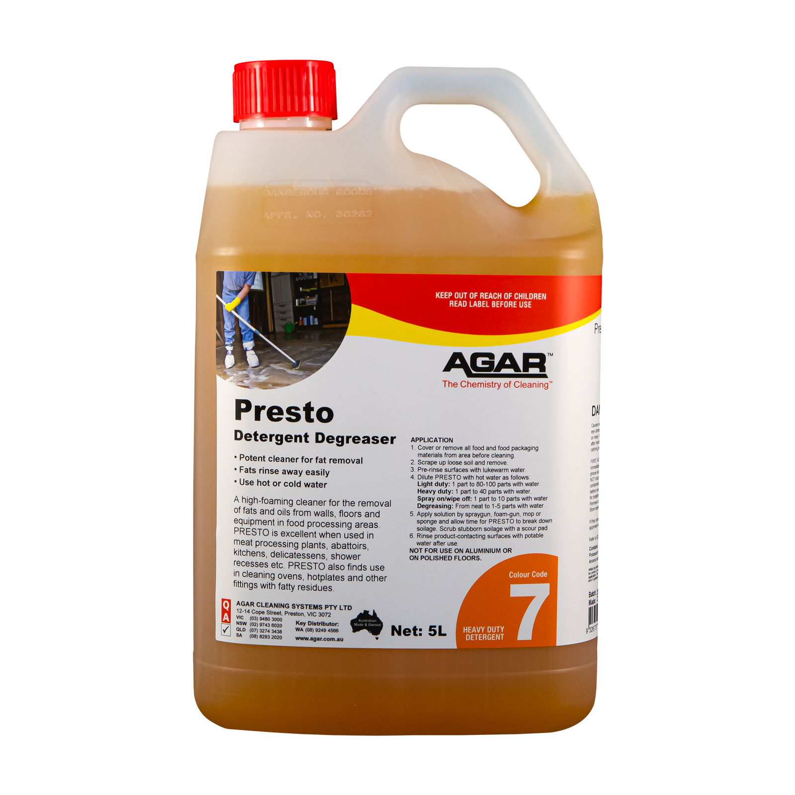 PRESTO is a concentrated, caustic-based cleaner-degreaser specifically made for fat removal. It will remove fatty, oily soilage, baked-on fats, carbon residues, food spillages and fatty films from most hard surfaces.