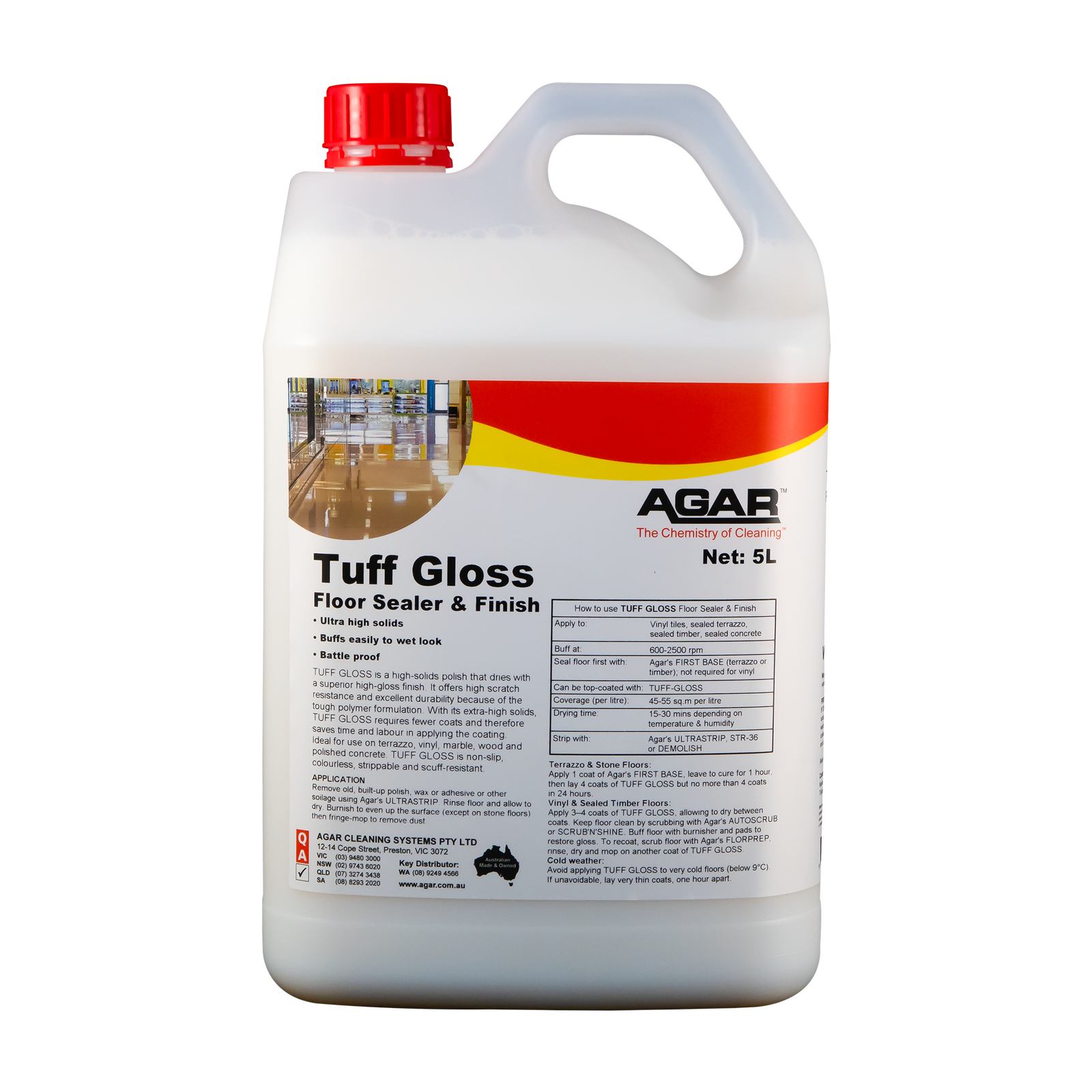TUFF GLOSS uses advanced polymer technology to create a dual-action polish that is both ultra-durable and beautifully glossy. With extra-high solids, TUFF GLOSS requires fewer coats and saves time and labour. TUFF GLOSS has high scratch resistance and responsive buffability which means that it will maintain its shine and extend the time between your strips and seals.