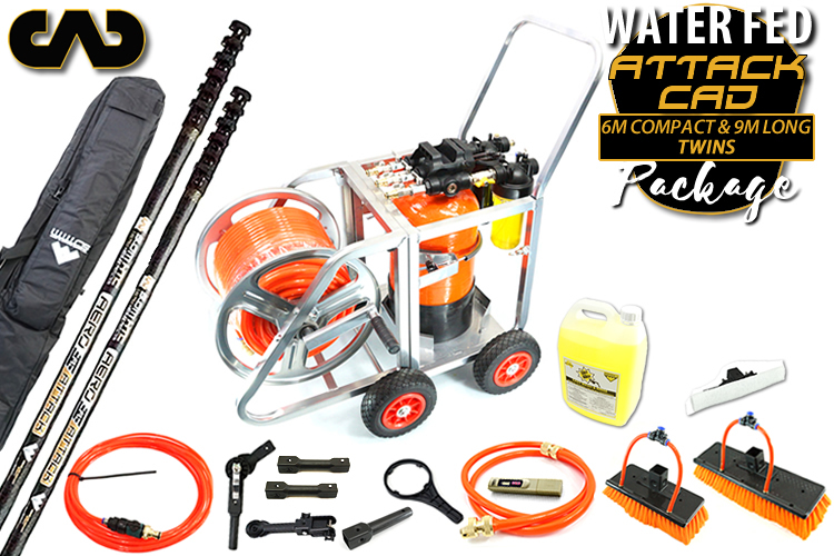“Twins package” featuring the BRILLIANT NEW compact and long 100% carbon non-round Aero CAD Attack poles, dual DI outlets bypass outlet – 12.5L GO H2O Pro DI System with detergent dispenser on all-in-one trolley with removable compact hose reel & 80m hose, 9m CAD Attack pole, 6m CAD Attack pole, 8” & 12″ brushes, pole bag and everything else you need!