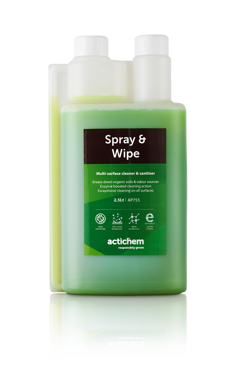 - Spray & Wipe is ideal for all hard surfaces, including walls and floors. It is suited for use in a spray bottle or mop bucket. Regular use eliminates the need to use harsh, deep clean chemicals.