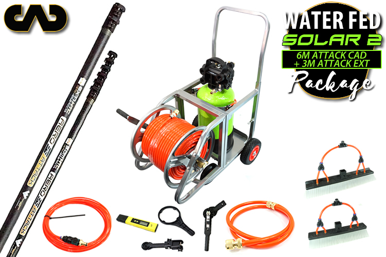 Residential, Commercial and Industrial solar package – BRILLIANT NEW 100% carbon non-round Aero Attack CAD 6m pole with 3m Extension (9m total length), 12.5L Solarwash Solar Panel Cleaning System on trolley, 80m hose & reel, 16” brush, 12″ brush, Wiel-Loc adjustable angle adapter, secondary angle adapter arm, swivel adapter, Hose leader, 12m pole hose, Pole hose valve, Hose connector, pH meter