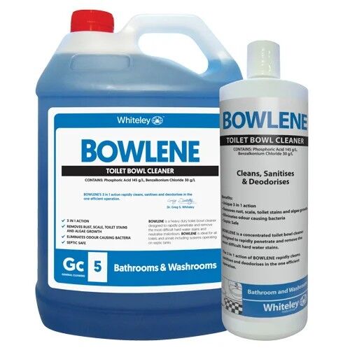Bowlene is a concentrated phosphoric acid toilet bowl cleaner designed to tackle even the toughest stains and odours. Its 3-in-1 action rapidly cleans, sanitises, and deodorises, making it ideal for maintaining hygiene in toilets and urinals – including those connected to septic systems. Formulated to penetrate deep into surfaces, Bowlene effectively removes hard water stains, rust, scale, algae, and odour-causing bacteria. It also helps control fungi and neutralises persistent bathroom mal-odours caused by bacteria in porous tiles and urinal pipes. Available in 1L and 5L sizes, the 1L bottle includes a specially designed applicator for easy under-rim application.