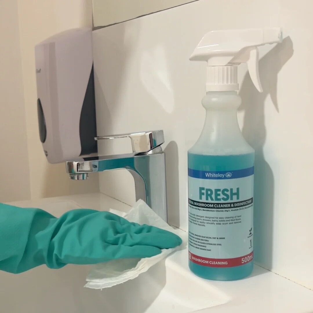 Fresh is an all-in-one application that rapidly cleans and disinfects washrooms and bathrooms including; showers, sink basins, tiles, and toilet in one efficient operation.